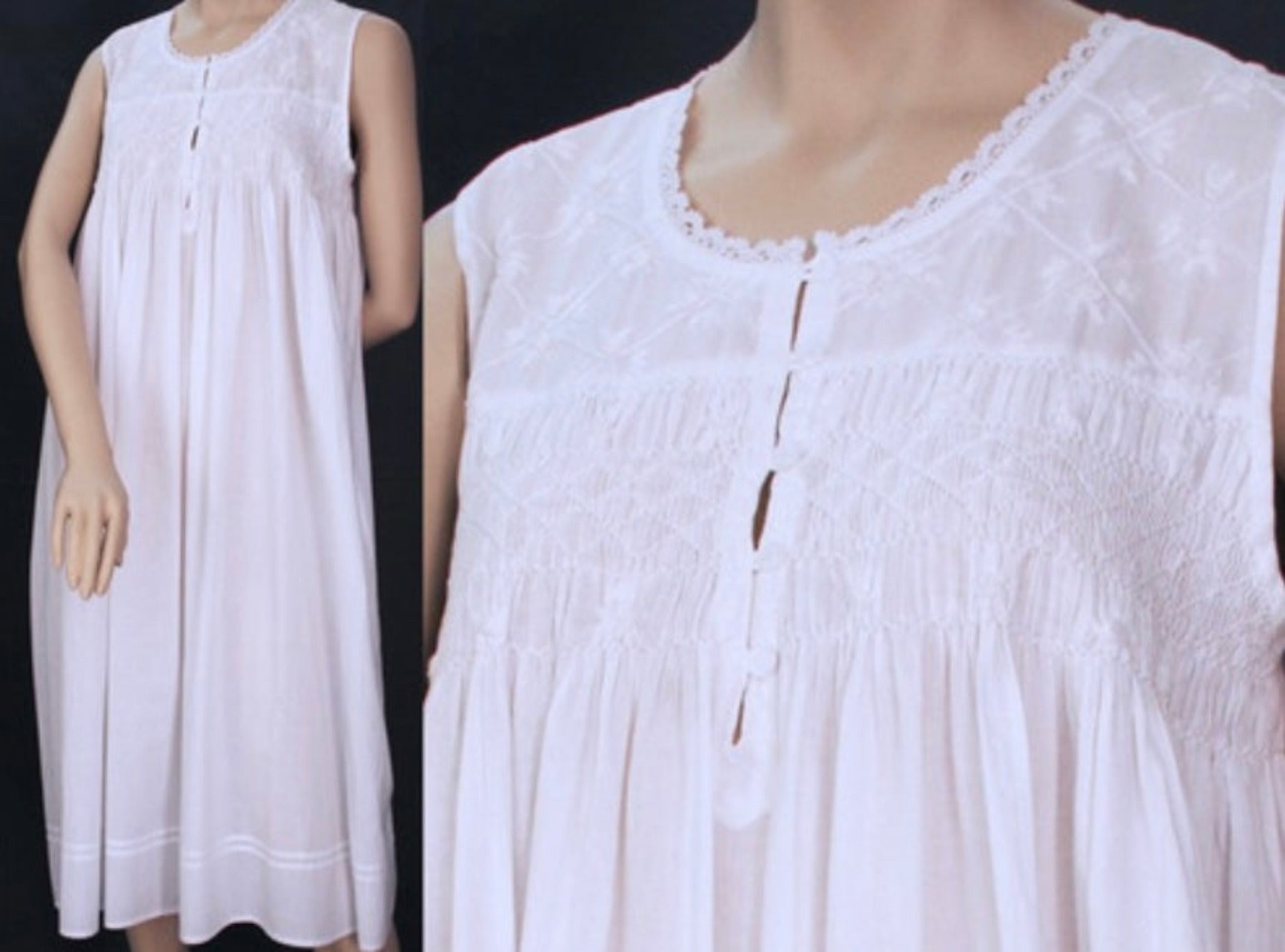 Indulge in the luxury of our Hanna White Cotton Nighty. Soft, lightweight cotton fabric is delicately adorned with white embroidery and a smocked bodice to create a nightwear design that is both comfortable and beautiful. The front opening has rouleau loop buttons. Enjoy relaxing nights in comfort and timeless style.