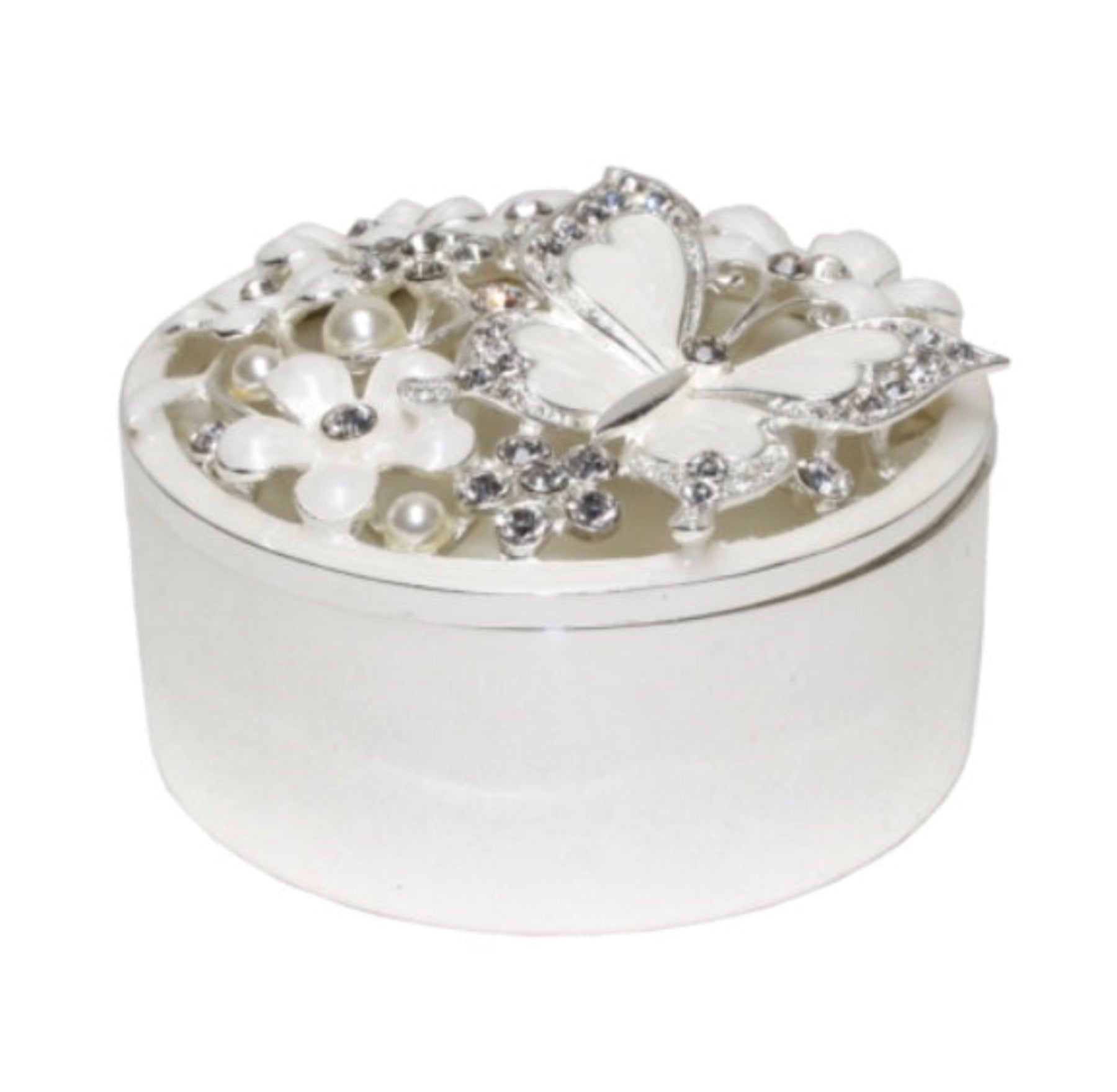 Our Ivory Enamel Butterfly Jewellery Box is a sophisticated accessory designed to protect and display your precious items. Crafted in ivory enamel, it features delicate butterfly accents embellished with sparkling crystals, adding a touch of refined elegance. This jewellery box provides an organized space for your collection, making it both a practical and decorative addition to your vanity or dresser. Perfect for those who appreciate craftsmanship and subtle luxury.